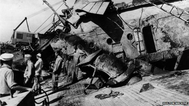 The Oklahoma was one of several warships targeted by Japanese submarines and aircraft in the surprise assault on 7 December 1941. More than 2,400 people were killed.